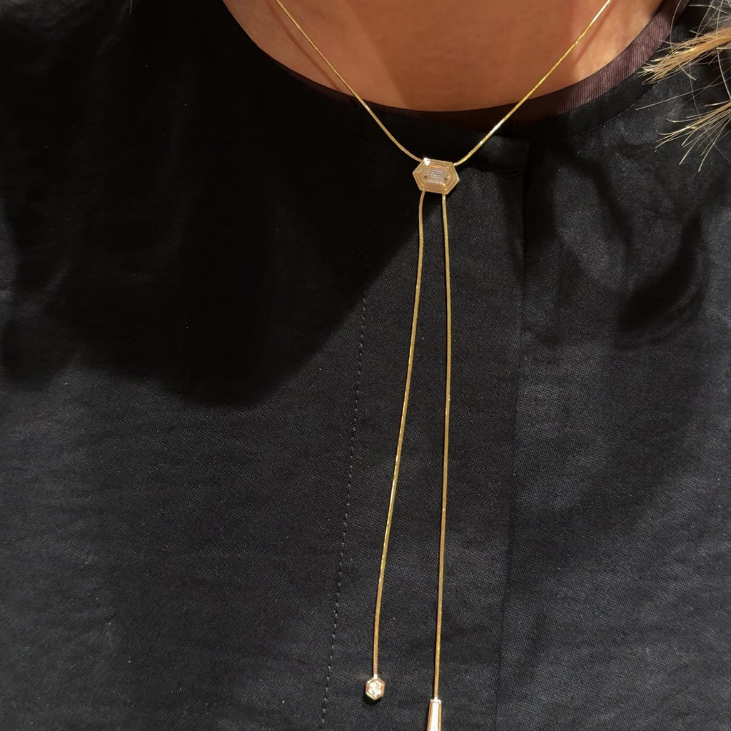 Our new DRUEX lariat necklace is unlike anything else in our lineup. Featuring a hexagonal diamond at the clavicle that cascades into two more dangling diamonds, this multi-shape piece is all about the abstract. Made to be worn dressed up or down, our team loves it with a simple white tee. DRUEX has definitely earned her spot on our wish list.