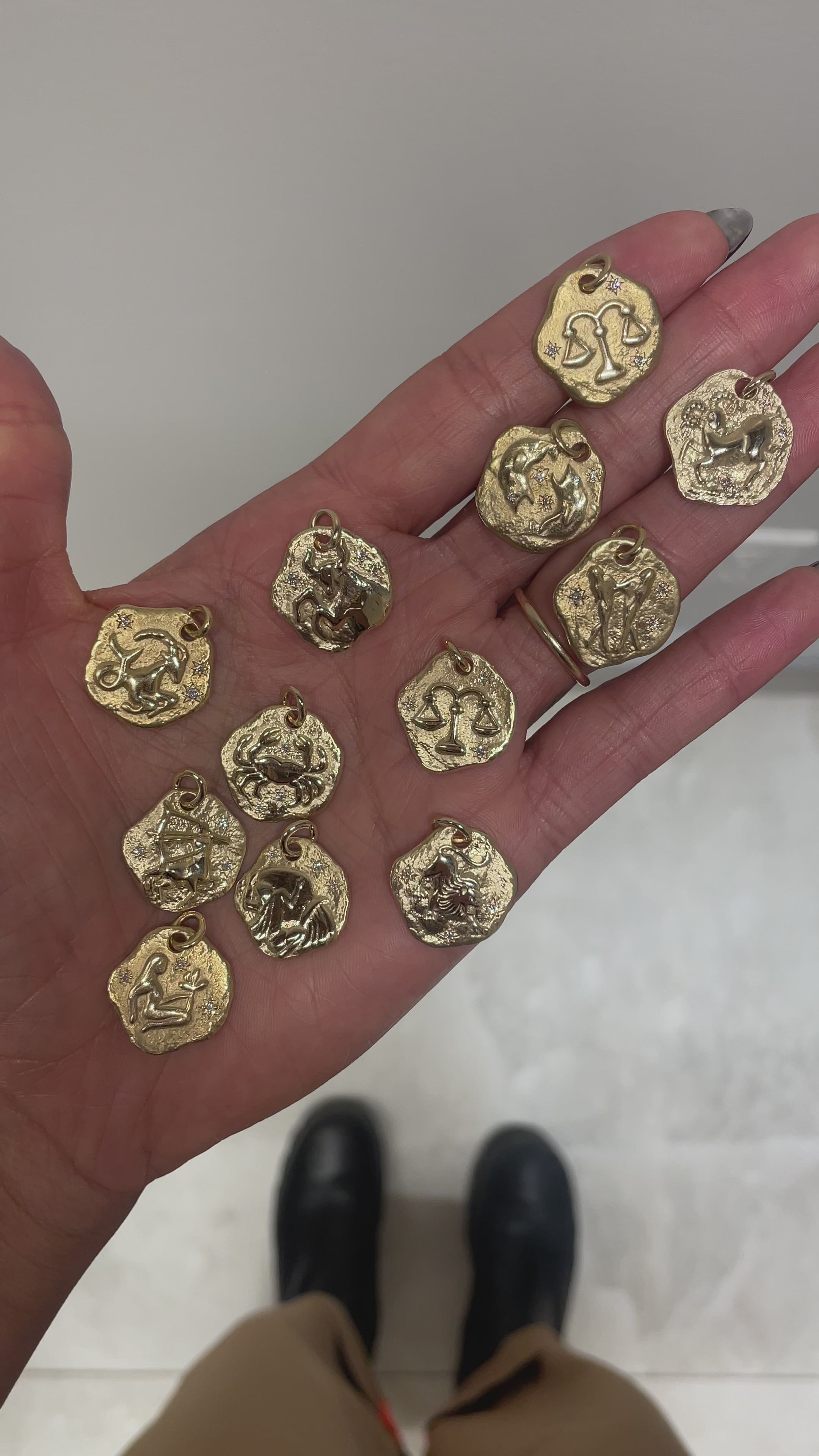 These medallions pair a brushed finish to mimic the organic and weathered feel of a gold coin with a high shine polish zodiac design to honor the cosmic energy and spirit of the wearer. The collection includes 12 UNIQUE Zodiac Medallions hanging from a beautiful yellow gold rope chain.
