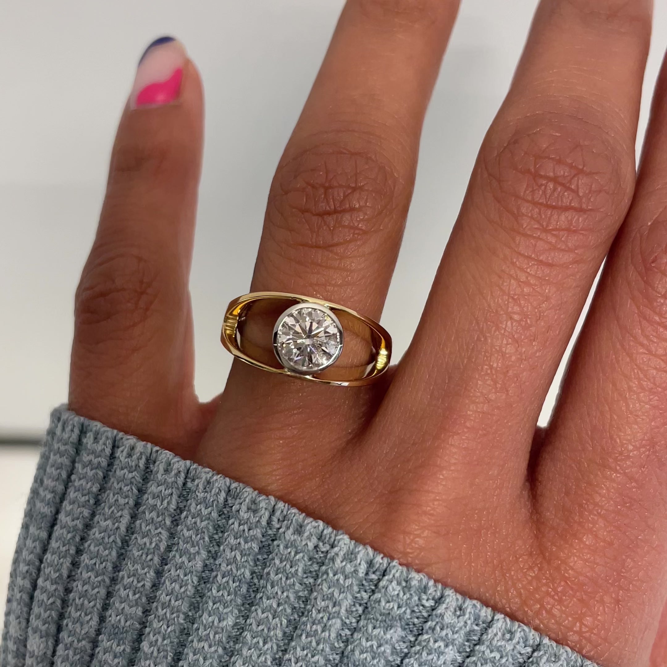 Evoking timeless beauty and spiritual connection, the vintage-inspired Saura Ring features a tension setting that creates a striking negative space around a center round brilliant diamond. Its split shank design highlights the two-tone combination of luxurious yellow and white gold. Inspired by the Hindu name meaning "Celestial," this ring captures both elegance and cosmic energy in a modern, wearable form.