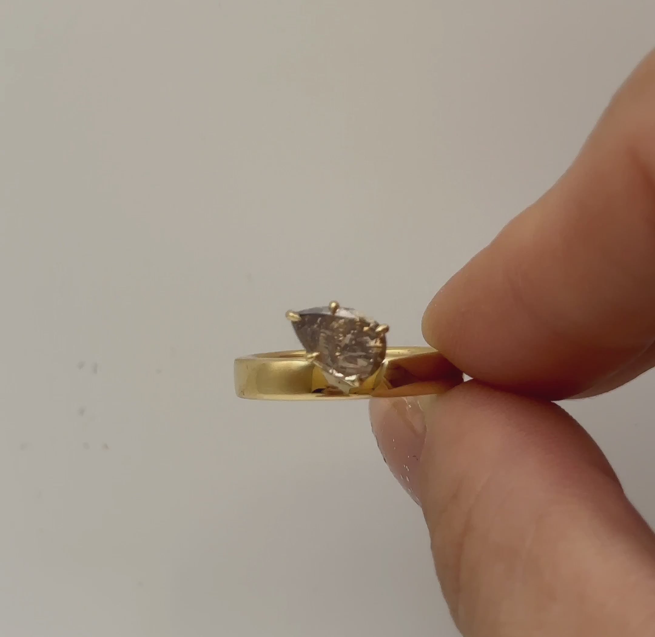 Embodying the Earth's rich amber hues, TAWNI 1.03 showcases a 1.03-carat Fancy Yellowish-Brown pear rose-cut diamond. Delicately held in place by a 5-prong setting, TAWNI 1.03’s pear rose-cut diamond takes center stage atop an 18KT yellow gold band.