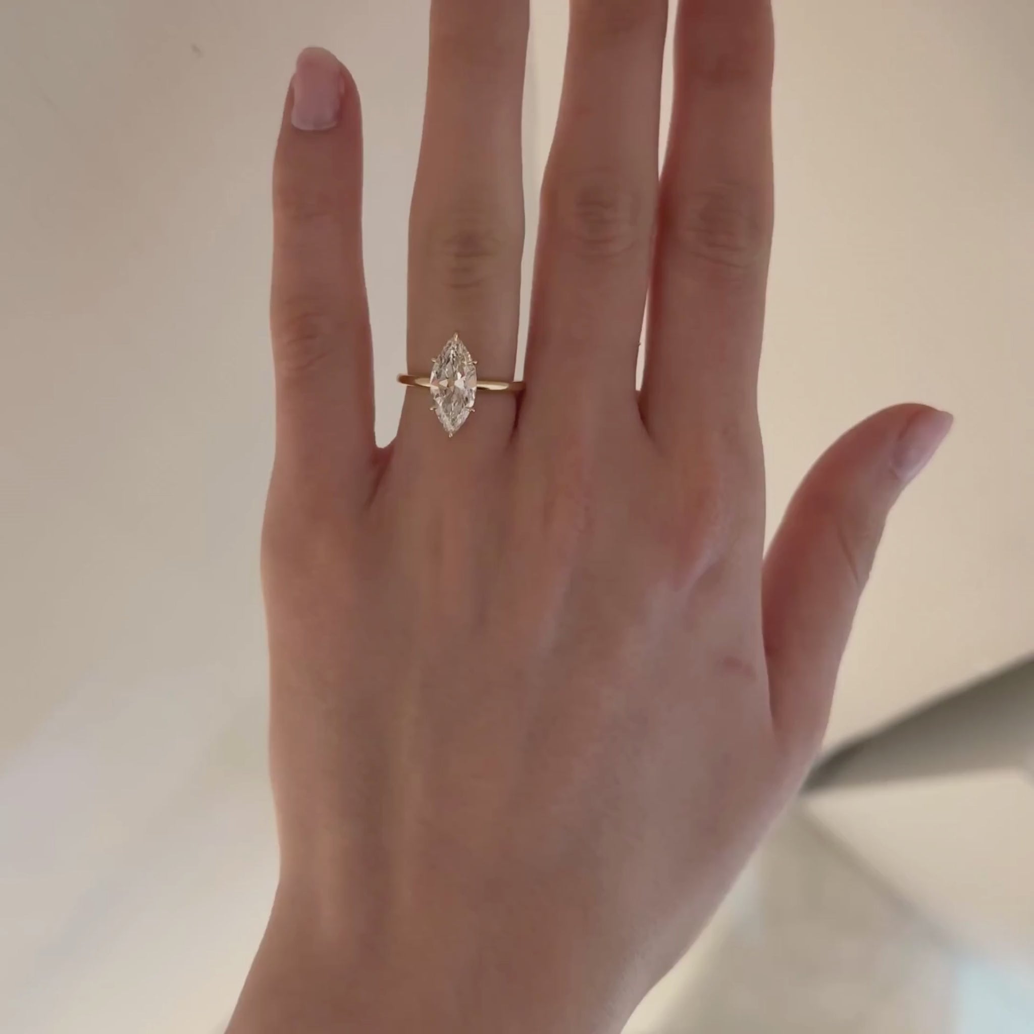Hand wearing a gold ring with a diamond on a neutral background