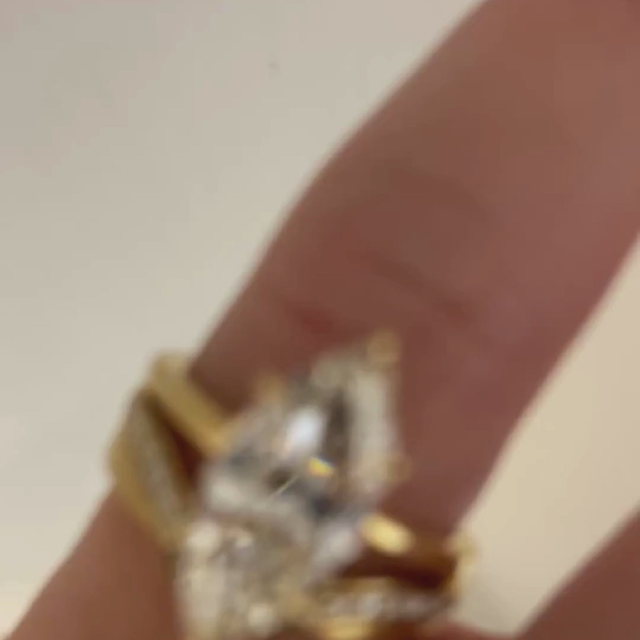 Gold ring with a diamond held by a hand against a neutral background