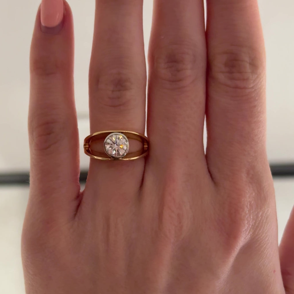 Evoking timeless beauty and spiritual connection, the vintage-inspired Saura Ring features a tension setting that creates a striking negative space around a center round brilliant diamond. Its split shank design highlights the two-tone combination of luxurious yellow and white gold. Inspired by the Hindu name meaning "Celestial," this ring captures both elegance and cosmic energy in a modern, wearable form.