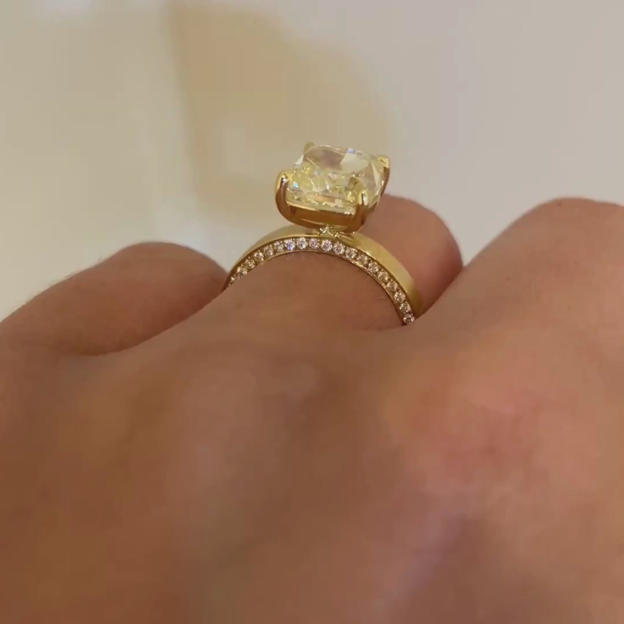 This SELENE ring embodies timeless elegance with a modern touch. At its center rests an extraordinary 4.10 carat cushion-cut diamond, admired for its gently rounded corners and glowing brilliance. Graded WX body color with VS2 clarity, the diamond carries a soft warmth while maintaining an eye-clean appearance, making it both distinctive and refined.