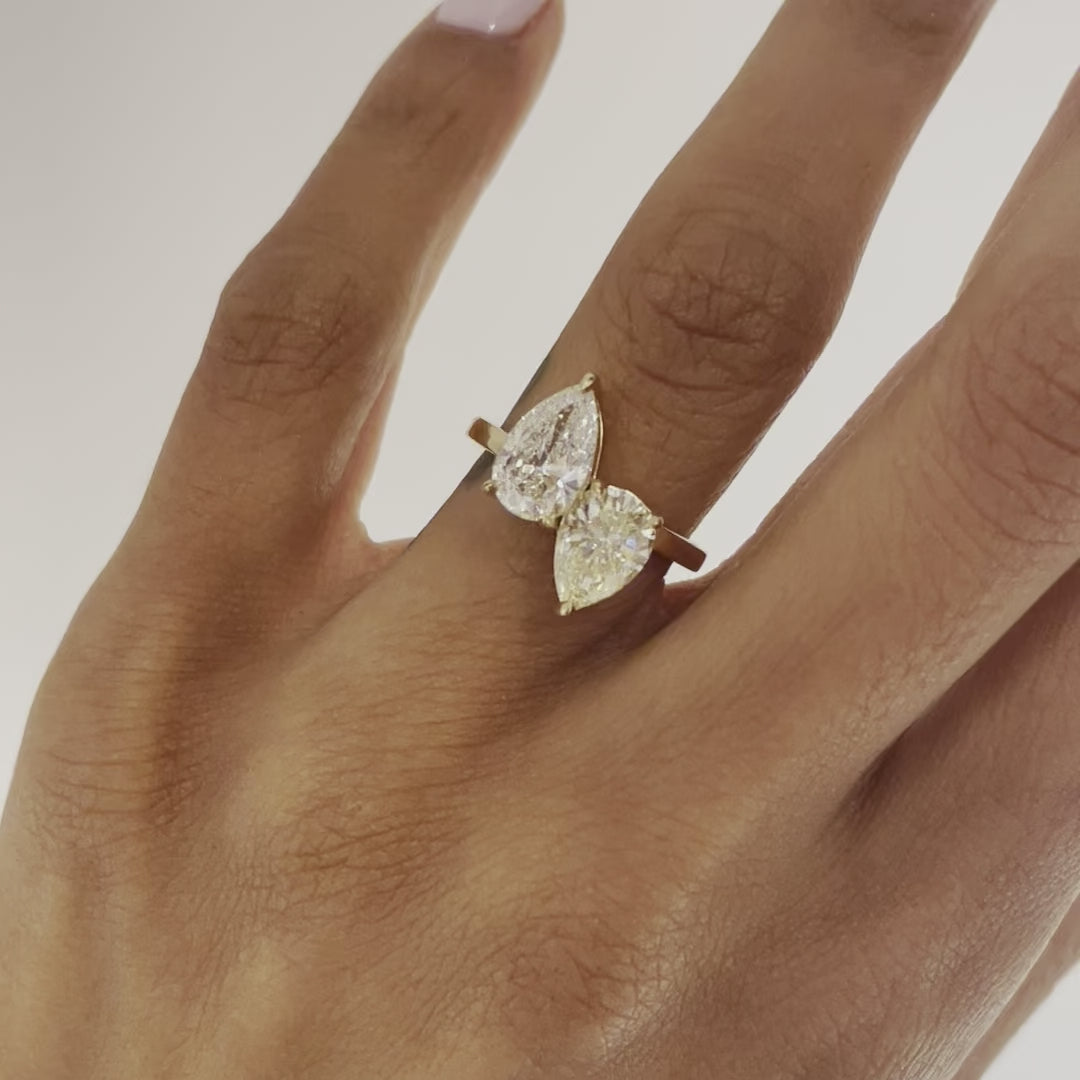 Our ZORINA ring captivates the imagination with two pear-shaped diamonds centered on a slender gold band. Meaning “golden dawn” in Slavic, ZORINA pairs a classic white diamond with a stunning yellow diamond. The basket settings are both accented with the birthstone of your choosing.