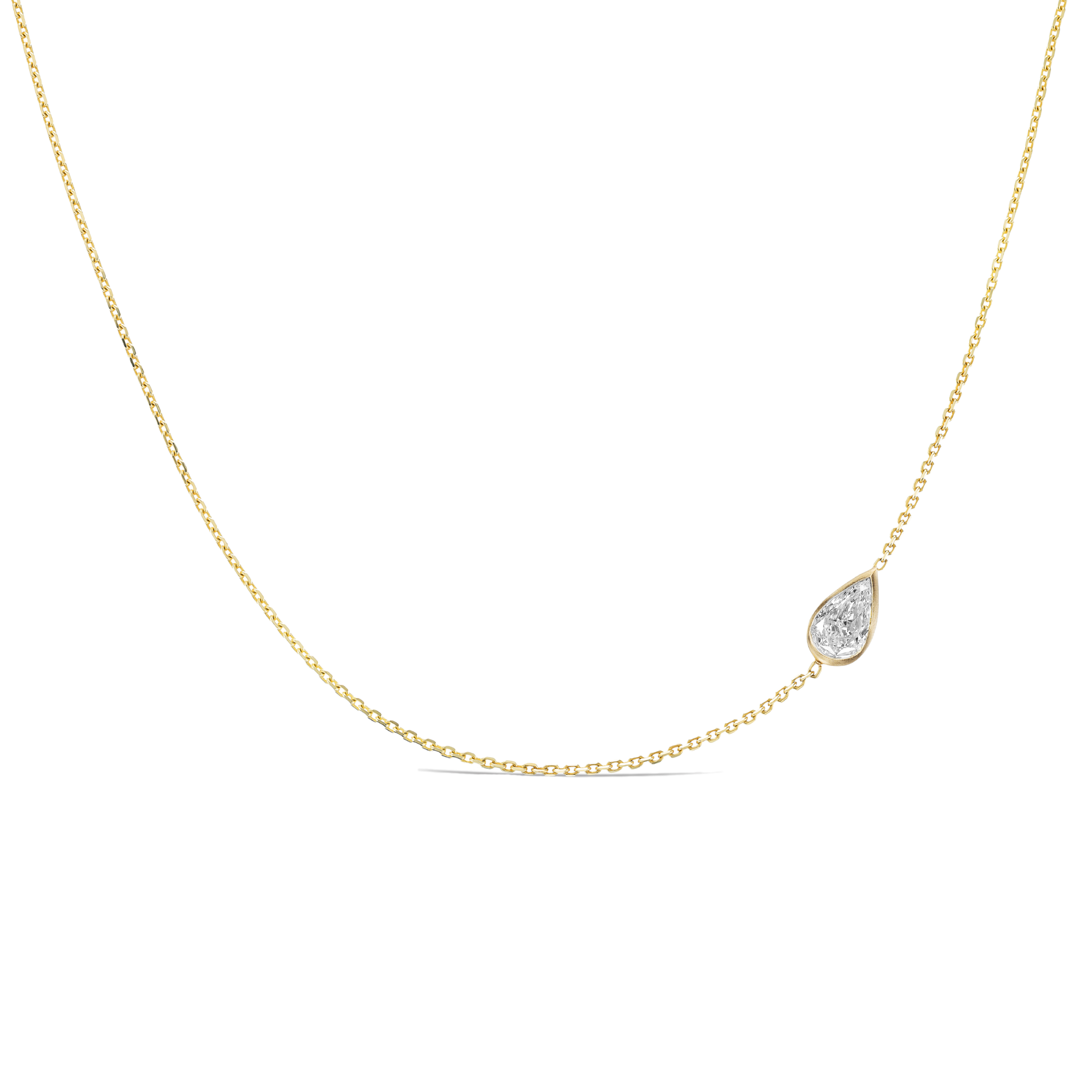 Close-up of a person wearing the Druex Lariat Necklace with bezel-set hexagonal center diamond, hexagonal and tapered baguette accent diamonds.