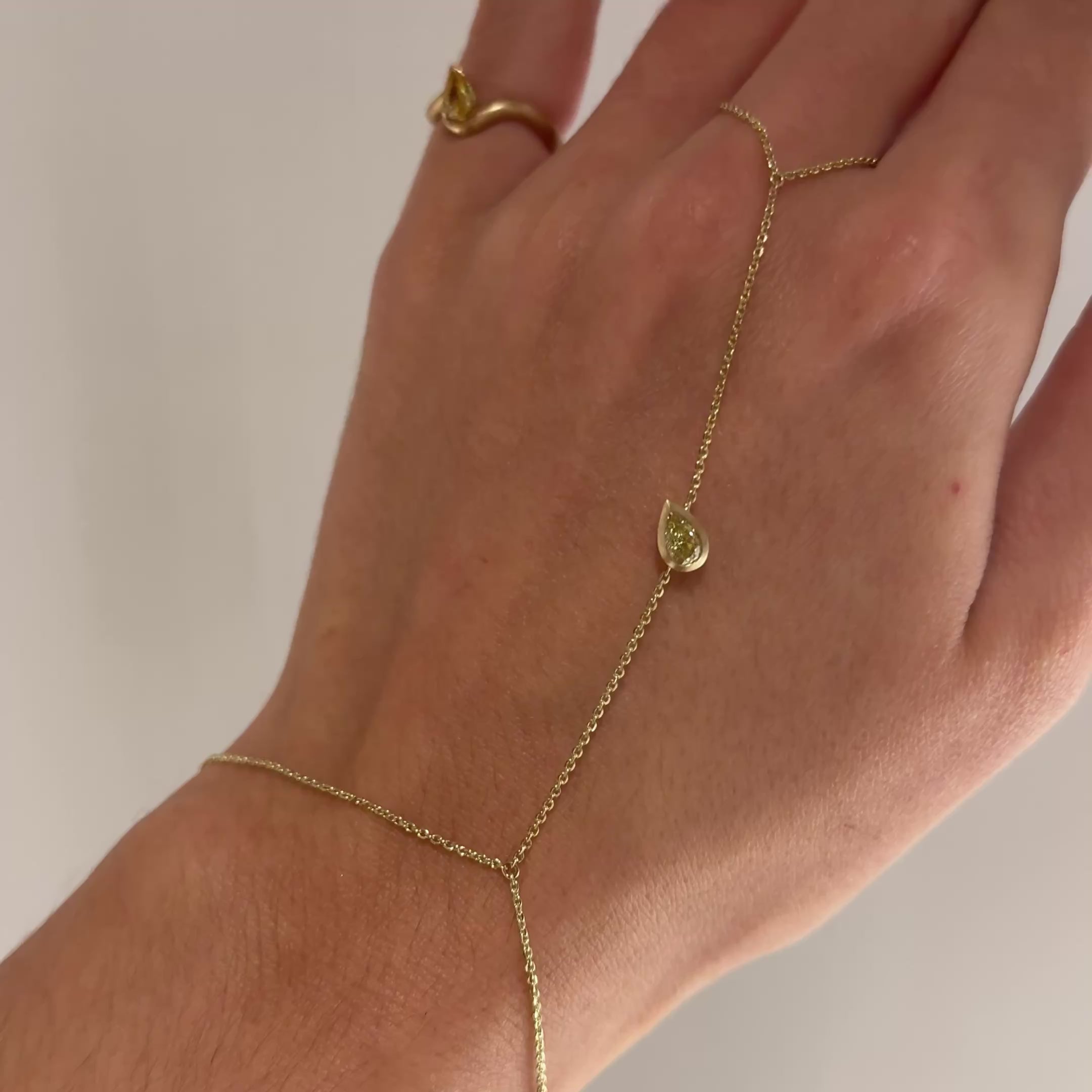 Delicate yet striking, this hand chain drapes effortlessly across the hand, connecting wrist and finger in a shimmer of 14kt gold. Each bezel-set stone, in white, yellow, or brown diamond, or luminous white sapphire, catches the light with every movement.