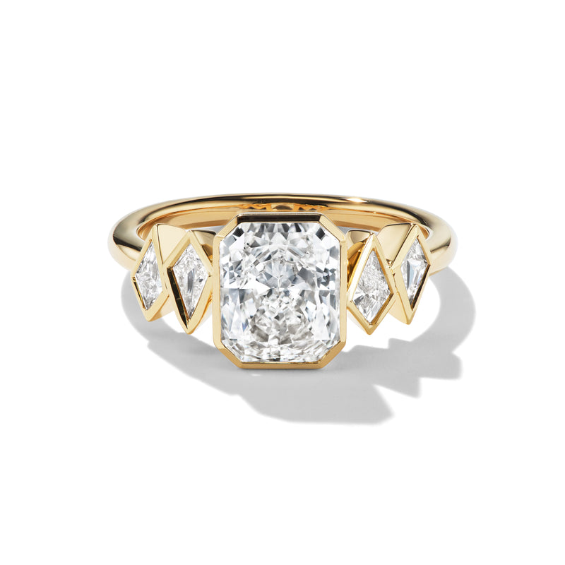 Exuding glamour and edge, welcome AABHA. Crafted in 18KT Yellow Gold, AABHA showcases a 2.04 carat radiant cut delicately accompanied by four kite side stones, all set in a secure bezel setting.