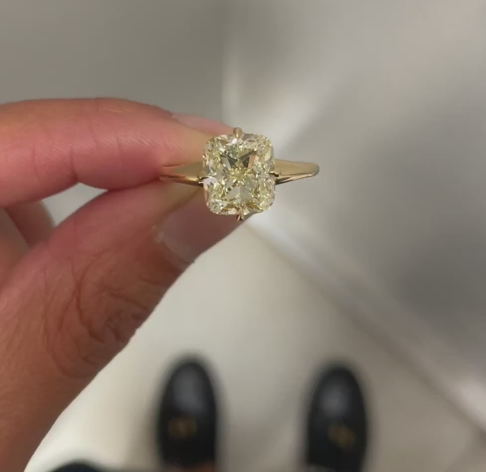 Inspired by our beloved MAE ring, MAE 3.70 is a timeless blend of vintage elegance and contemporary allure. Our MAE 3.70 showcases a 3.70 carat Cushion Modified Brilliant Cut diamond in a beautiful, lemon hue atop a rounded comfort fit band secured by a claw-prong setting.
